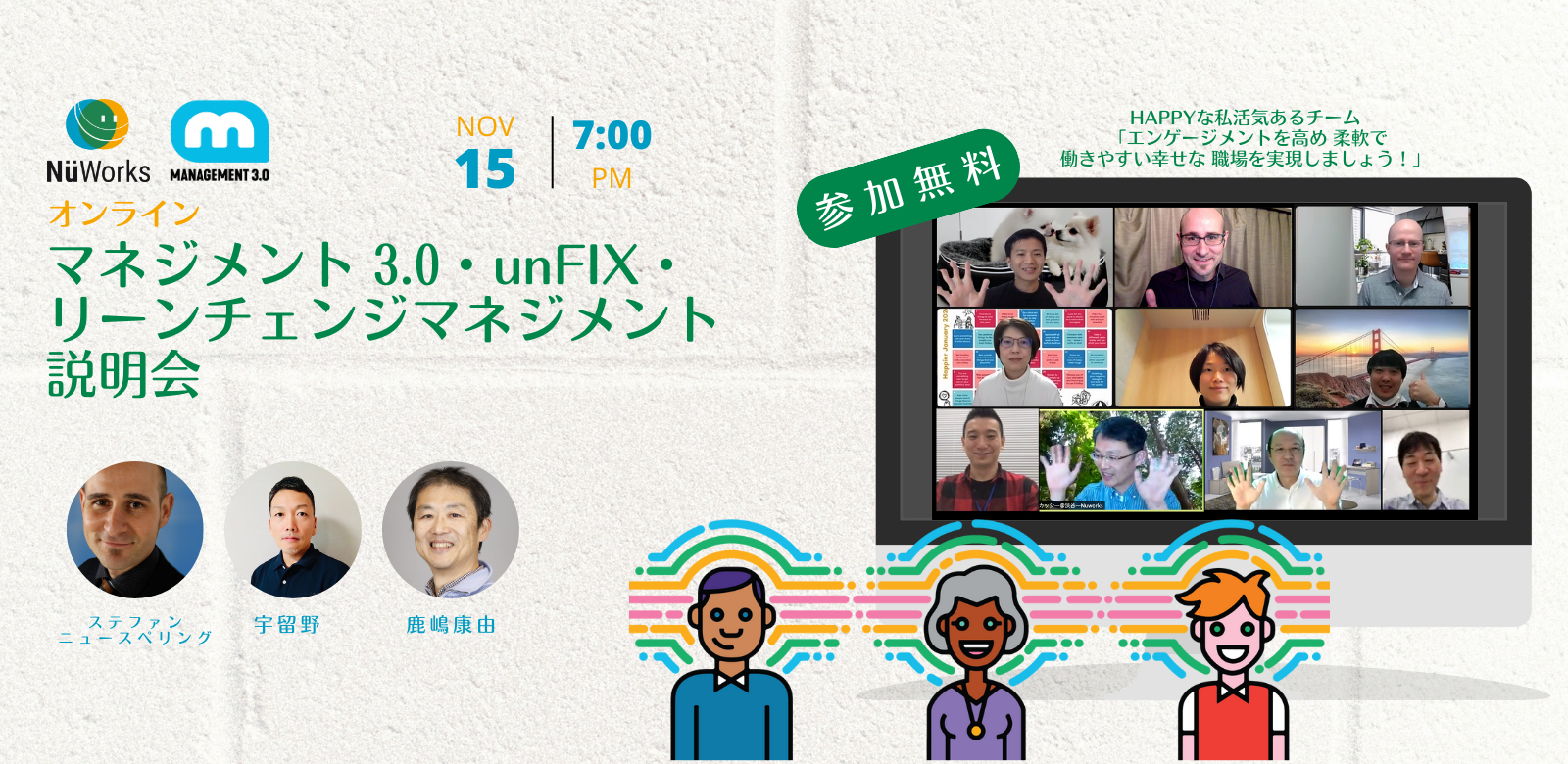 マネジメント 3.0・unFIX・リーンチェンジマネジメントの考え方やゲームやツールについてご説明し、マネジメント 3.0を実践された宇留野さんの実践のお話をうかがいます。