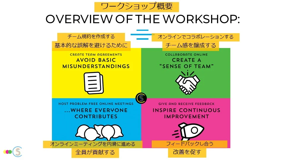 このワークショップでは、オンラインでの仕事に課題を抱えている方、今後どのようにオンラインでうまく働いていったらよいかヒントを得たい方向けの内容で構成されています。