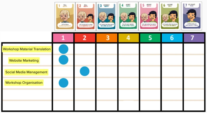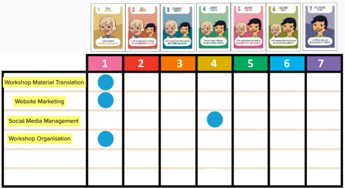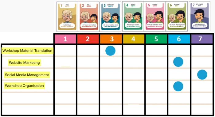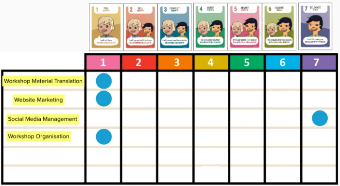 Team empowerment is an ongoing process and we are always growing. That means that also the delegation-level are in constant change. Kumiko is now very ambitious and willing to take on new challenges. Last year she became an IKIGAI coach and has run already several IKIGAI workshops. And since last month she also became an official Management 3.0 facilitator. She already assisted in one session and I am happy that she is increasing the diversity of Management 3.0 facilitators in my team.