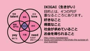 IKIGAIはこのように「好きなこと」「得意なこと」「世の中が求めていること」「お金を得られること」4つの輪が重なったところを意味します。