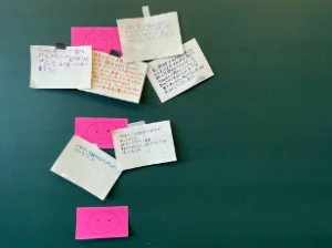 規模が小さいこともあり、みんなニコニコ顔に貼ってくれるのは見えてるのですが、フィードバックはほぼ100%、子供も書けるというのがWEBアンケートとは大きく違う良さだと思います^^