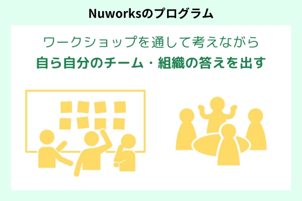 NuWorksでは、解決までの道のりを、参加者の方が自力で進めるような地図を一緒に作っていくことを目指します。生産性を上げ、より新しく重要なことに取り組み、幸せに働く人を増やせるようにお手伝いをいたします。